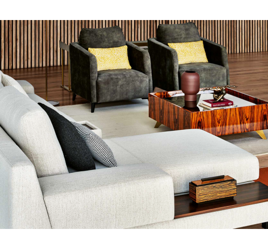 It offers you endless possibilities due to the number of options you can choose from, modifying either the chaise longue or the module, with or without a table, with one or two arms.