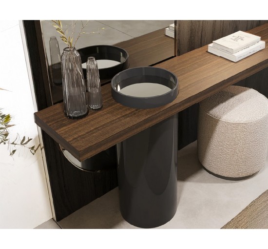 This console features a structure with high-gloss lacquered legs, complemented by a top finished in lacquer or wood, which brings elegance and practicality to the room.