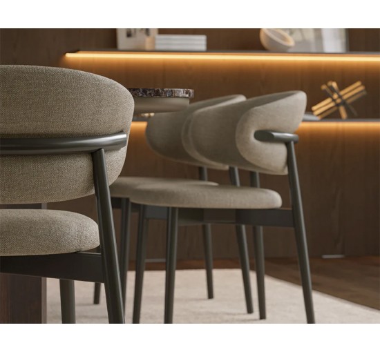 In this spirit, the chair combines comfort and elegance in a minimalist design, with solid wood, textured upholstery and careful ergonomics.