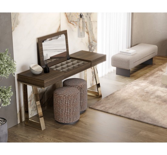 The dressing table completes the space with delicacy and utility, combining refined surfaces with a contemporary aesthetic that values organization and personal care.