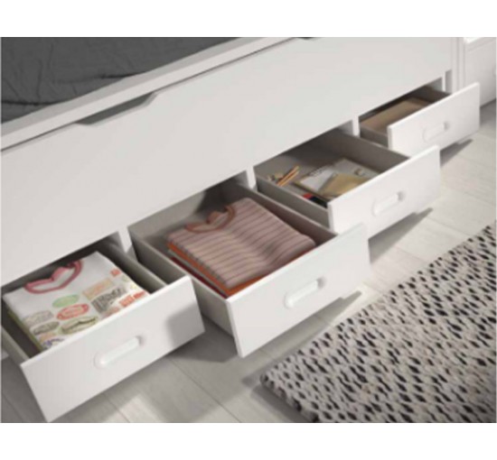 Underneath this second bed, there are additional drawers offering extra storage space.