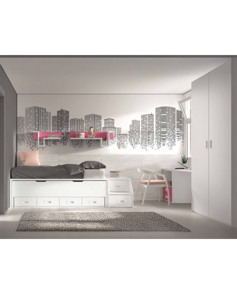 Practical and welcoming children's bedroom with double bed with storage drawers, desk with chair, shelves and closet, designed to maximize space and ensure comfort and functionality on a daily basis.