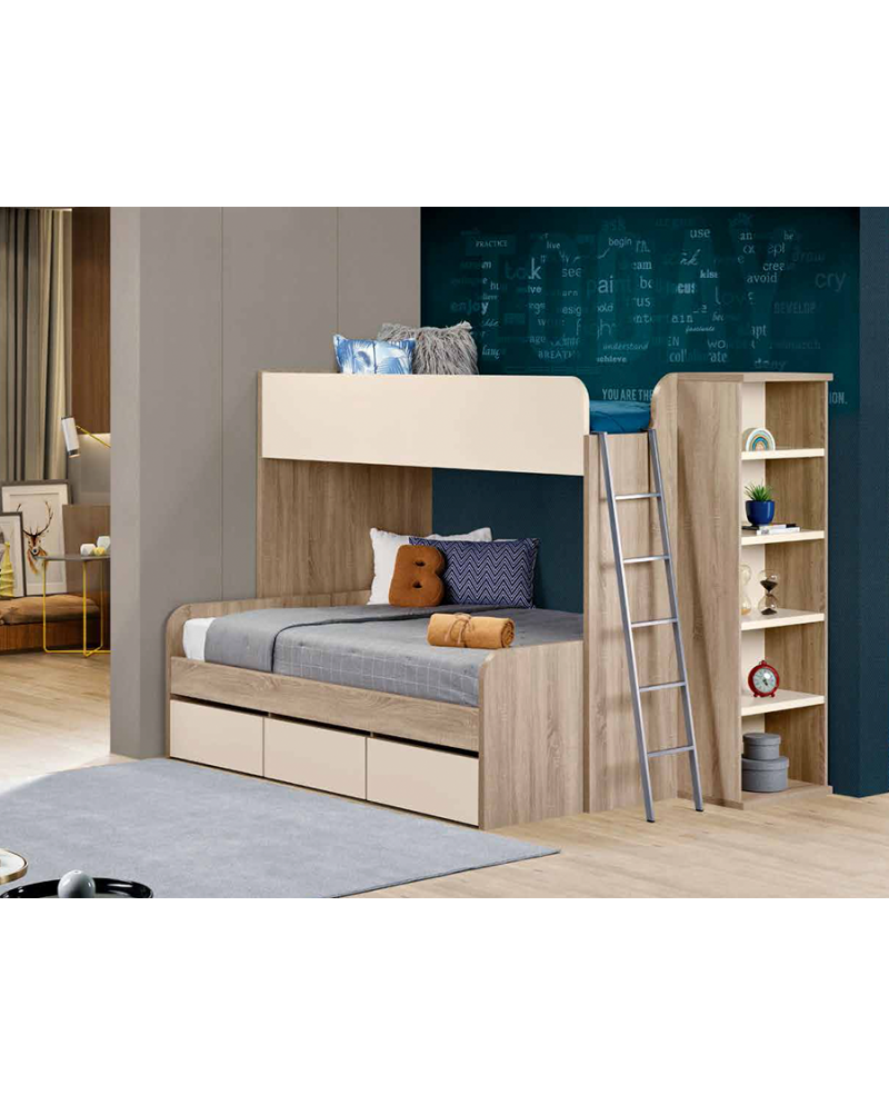 Children's bedroom with bunk bed, drawers, integrated bookcase and chest of drawers, ideal for making the most of space with comfort, organisation and style.