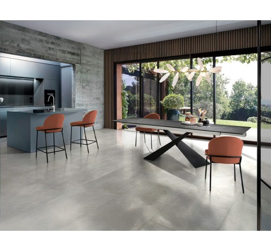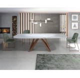 Extendable dining table with a contemporary design, featuring a durable porcelain top and a sturdy metal base that forms a sculptural cross. Thanks to its extension mechanism, it can be easily extended, providing versatility to accommodate different numbers of guests. A sophisticated piece that combines striking aesthetics and functionality, ideal for modern spaces that value both style and practicality.
