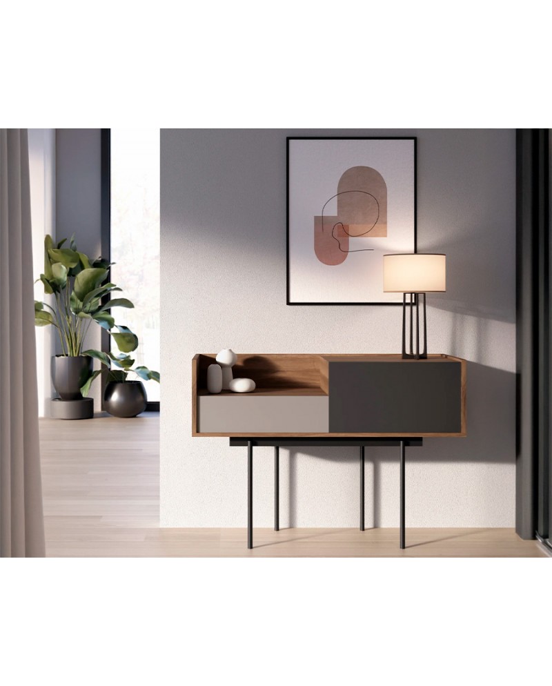 The Diplomat console table stands out for its functional and contemporary style, combining well-proportioned volume with clean, balanced lines that add elegance to any environment. With a single storage space that combines a smooth-opening drawer with a discreet door with anti-impact hinges, it is ideal for organizing essential items in the entrance hall, hallway, or living room. The console rests on slender metal legs, giving it visual lightness and a touch of minimalist sophistication. The versatility in the combination of finishes allows it to fit with distinction into various decorative contexts, harmonizing perfectly with your style.