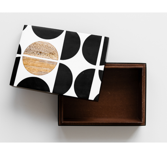 Boîte Resica avec détails en noir, blanc et chêne.
