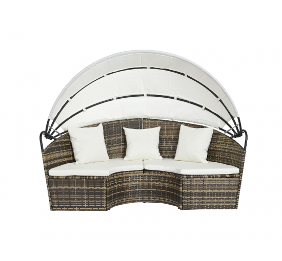 Ce lit relax d'extérieur peut être utilisé à la fois comme lit circulaire et comme ensemble avec un canapé, deux poufs et une table basse.