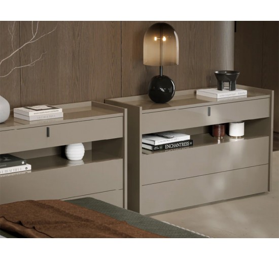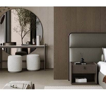 La composition est complétée par des tables de chevet avec des tiroirs discrets et un tabouret rembourré, offrant une fonctionnalité supplémentaire.