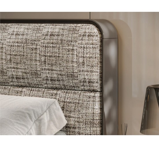 La tête de lit est recouverte d'un tissu texturé de haute qualité dans des couleurs neutres, alliant modernité et intemporalité.
