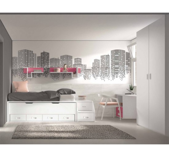 La composition est complétée par un bureau avec une chaise confortable, idéal pour les moments d'étude ou de créativité, des étagères pour l'organisation ou la décoration, et une armoire spacieuse qui aide à garder la chambre rangée et harmonieuse.