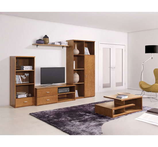 Un salon pratique et équilibré composé d'éléments avec étagères, tiroirs et portes, d'un meuble TV fonctionnel et d'une table basse rectangulaire.