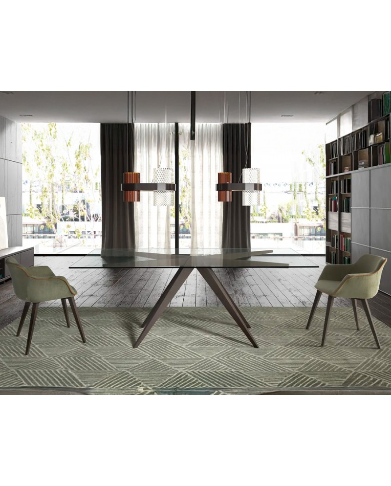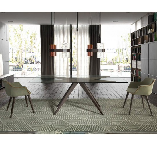 Table sophistiquée avec plateau en verre trempé et piètement en bois massif, idéale pour les espaces modernes.