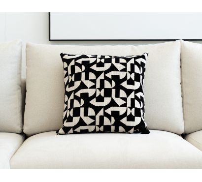 Tecido com padrão geométrico em tons de bege, laranja, castanho e preto.