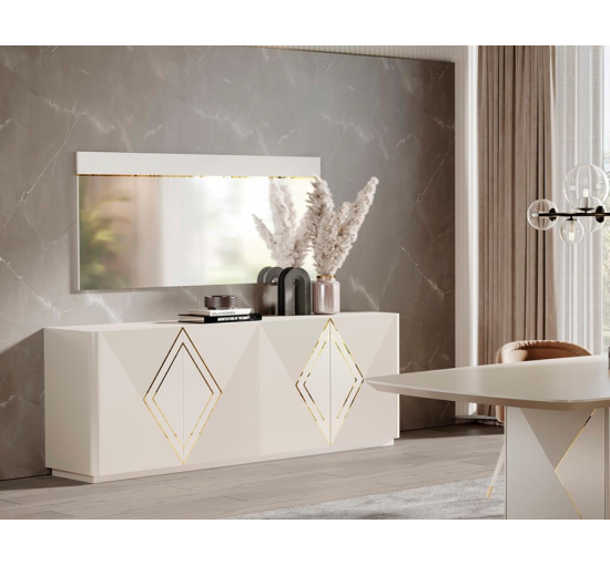 Para complementar, incorpora um espelho e um aparador, através das suas linhas fluidas e detalhes dourados, combinados pelas quatro portas.