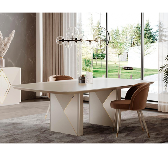 Este ambiente de sala de jantar inclui uma mesa de jantar elegante em lacado bege, com espaço para seis pessoas nas cadeiras com estrutura estofada.