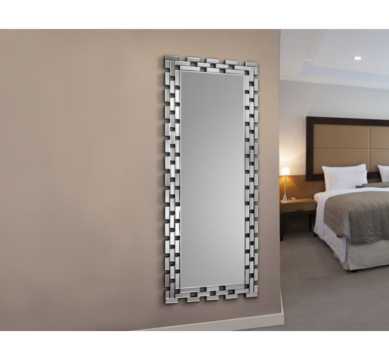 Espelho retangular com pequenos retângulos em espelho que formam uma moldura.