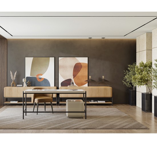 Escritório sofisticado com secretária minimalista, cadeira contemporânea, móvel de apoio funcional e aparador decorativo.