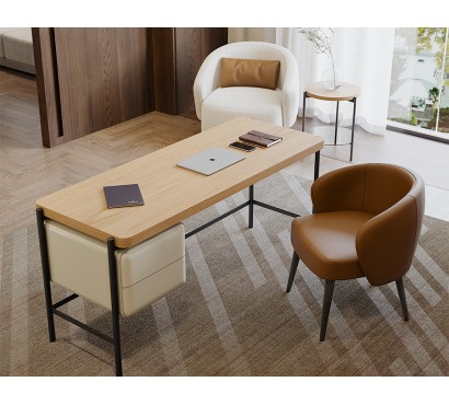 Um escritório elegante composto por uma secretária de design minimalista, que transmite leveza e modernidade, acompanhada por uma cadeira bege de estilo contemporâneo que oferece conforto e sofisticação.