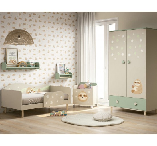 Quarto de bebé com tema de preguiça inclui uma cama divertida, prateleiras funcionais, carrinho de arrumação, roupeiro e cómoda, criando um ambiente relaxante e prático.