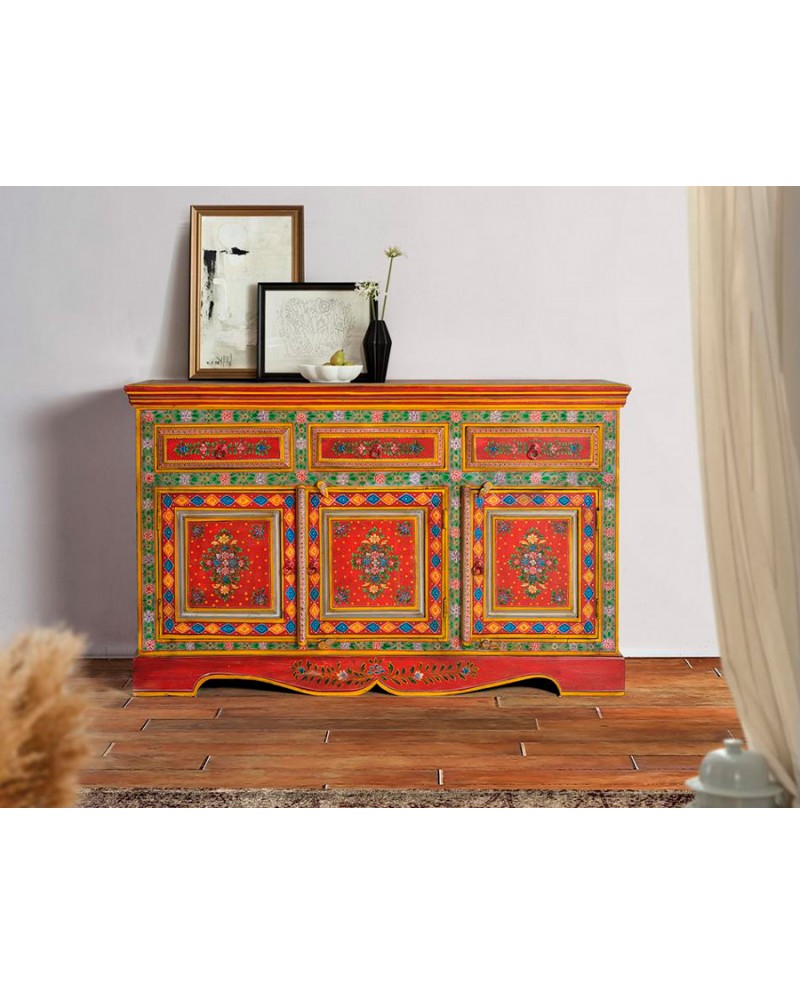 Este encantador aparador em madeira reciclada destaca-se pelo seu visual vibrante e artesanal, que traz vida e personalidade a qualquer espaço.