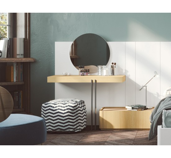 Ao lado, uma mesa de cabeceira de madeira, com uma gaveta e, ainda, para complementar, um toucador/mesinha como um apoio a acessórios e produtos essenciais. Um toque que todas as meninas adoram.