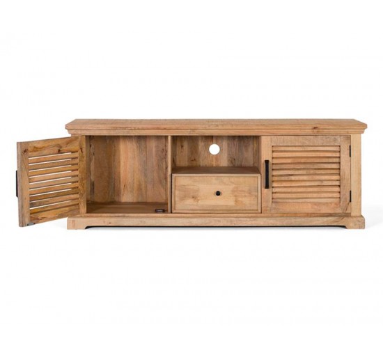 Móvel de televisão em madeira maciça de manga com acabamento natural, composto por duas portas e uma gaveta para arrumação.
