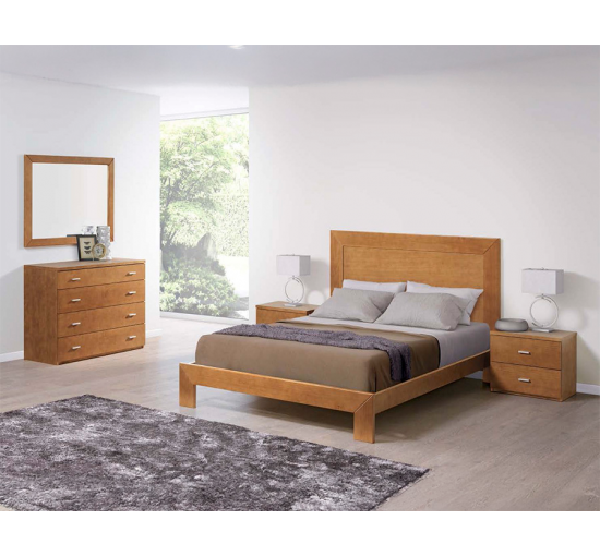 Quarto de casal completo com cama para colchão de 140x195 cm ou 133x183 cm, moldura decorativa, cómoda com 4 gavetas e mesas de cabeceira com 2 gavetas.