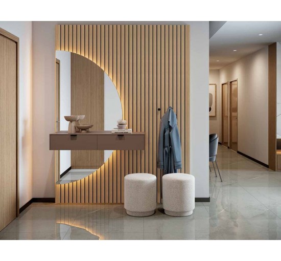 Dê as boas-vindas à sua casa com um hall funcional e elegante, com espelho, gavetas suspensas e um puff confortável para o seu dia a dia.