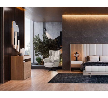 Este quarto de casal combina funcionalidade, conforto e elegância num só espaço. A cama, peça central do ambiente, é complementada por duas mesas de cabeceira com arrumação prática, ideais para manter o essencial sempre à mão. A cómoda, com linhas sóbrias e modernas, oferece espaço generoso para organizar a roupa, enquanto o espelho amplia a luminosidade e dá profundidade ao quarto. Aos pés da cama, a banqueta acrescenta um detalhe requintado e útil, perfeita para apoio no dia a dia. Já a poltrona, posicionada num recanto acolhedor, convida a momentos de leitura ou descanso, tornando este quarto num verdadeiro refúgio de bem-estar e estilo.