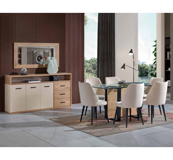 Esta sala de jantar foi projetada para oferecer um ambiente elegante, funcional e acolhedor. Com uma mesa de jantar espaçosa que convida a refeições confortáveis, um aparador sofisticado para organizar e expor itens decorativos, e um armário para armazenamento extra, este conjunto combina praticidade e estilo. Ideal para momentos em família ou com amigos, proporciona um espaço harmonioso onde conforto e organização caminham juntos, transformando cada refeição numa experiência especial.