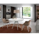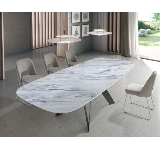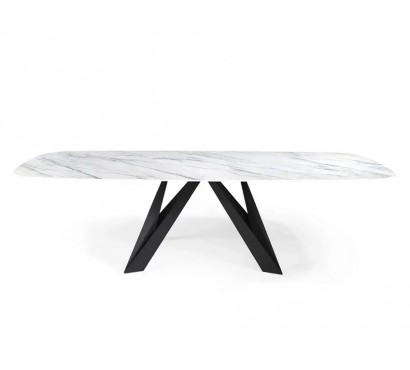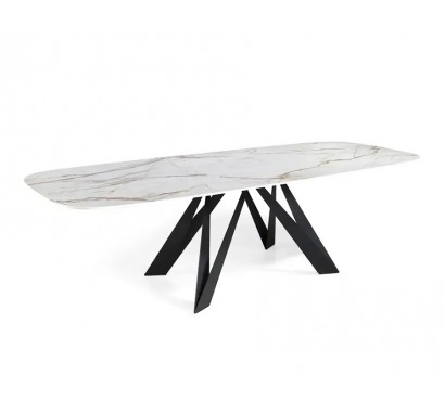 Mesa de jantar fixa com tampo em porcelânico de 3 mm sobre base em vidro temperado de 12 mm, cantos arredondados e acabamento polido, que asseguram elegância e segurança. Apoiada em pernas de metal lacado — normalmente em preto mate, mas personalizável segundo o catálogo de cores —, esta peça destaca-se pelo design contemporâneo e robustez, sendo perfeita para elevar a sofisticação de qualquer sala de refeições moderna.