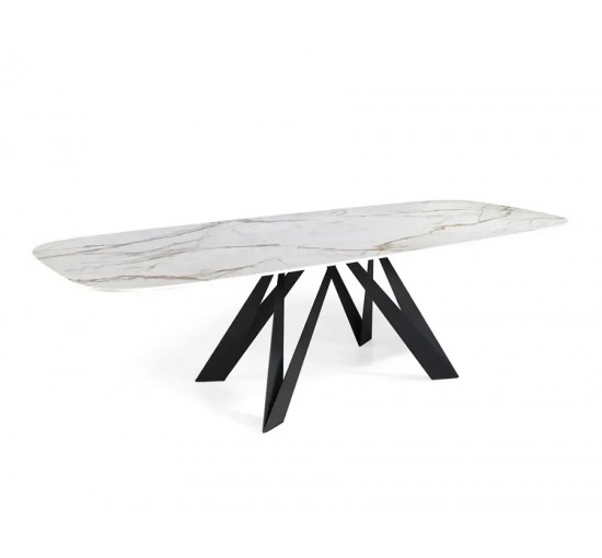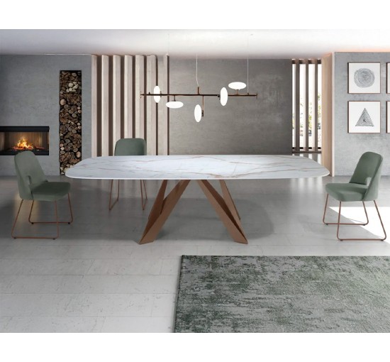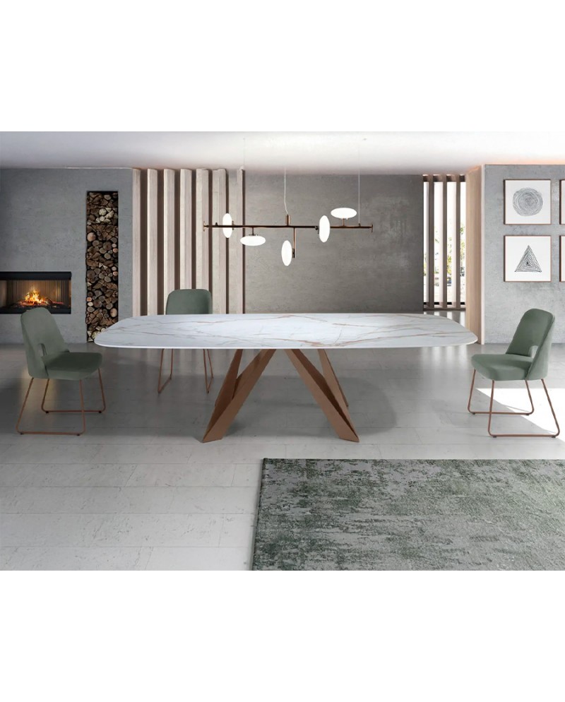 Mesa fixa sofisticada com tampo em porcelânico e base metálica personalizável, ideal para espaços modernos e elegantes.